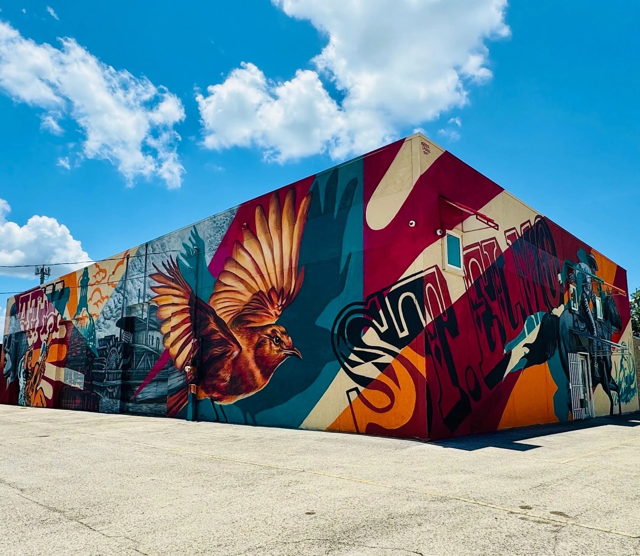 The front of the building is shared with H'N'C Coffee and IRL@ATX — the gallery wing that programs in rotation. Walk in for an espresso, browse the show, or book a suite. The three are designed to overlap.